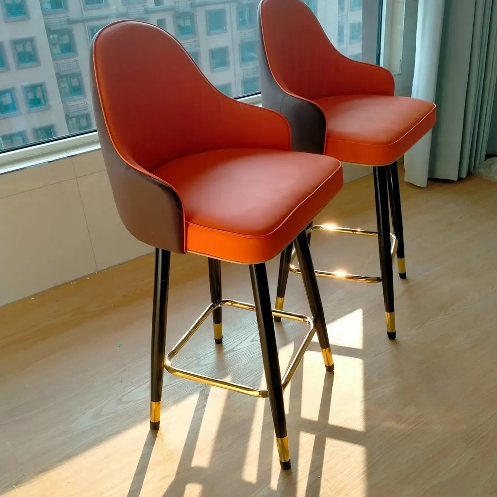 This modern bar stool is designed to lift the look of any kitchen, bar, café, or hospitality space. Wrapped in premium PU leather and highlighted with elegant gold accents, it brings a clean, contemporary style with excellent comfort. The curved backrest offers supportive seating, while the padded cushion and sturdy footrest create a relaxed sitting experience suitable for long hours.