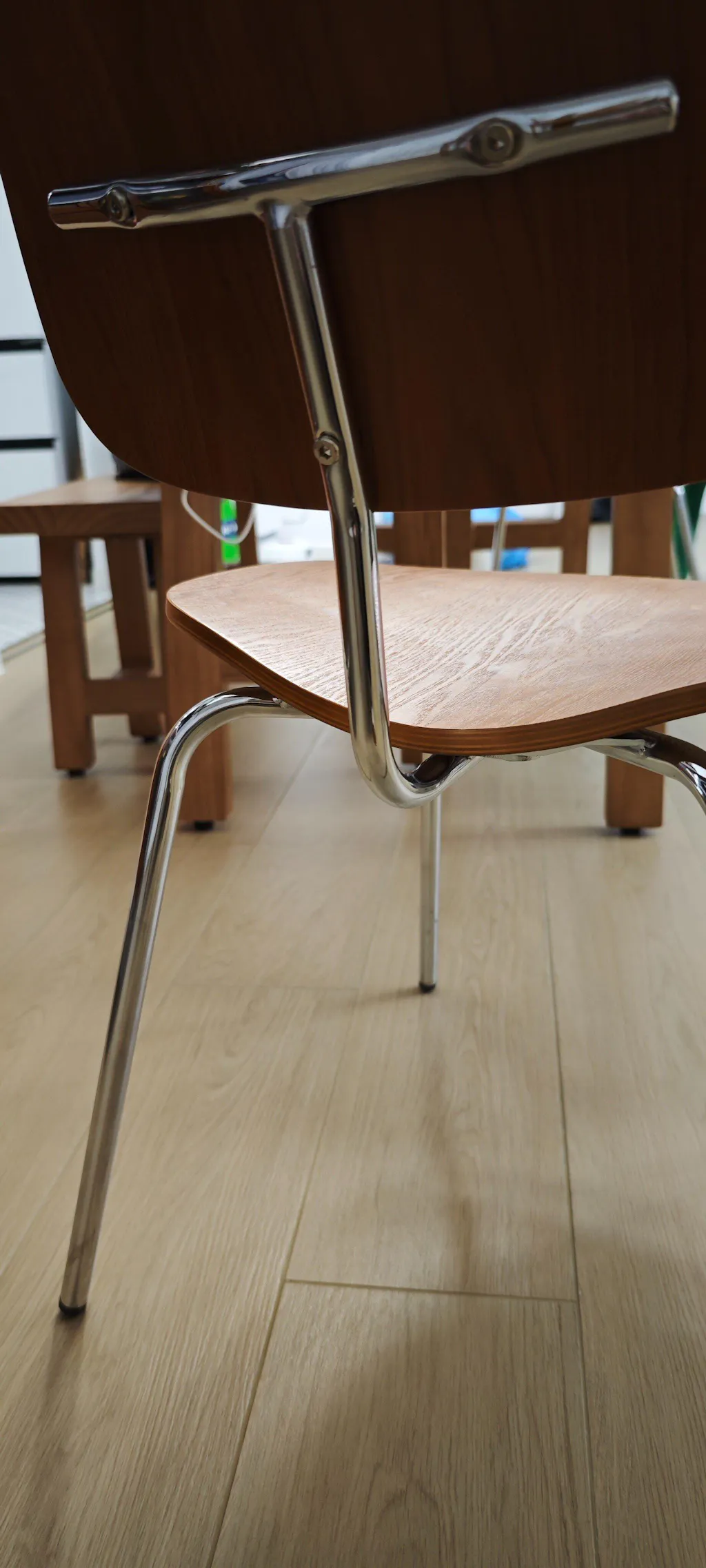 A: Suitable for moderate commercial use—the reinforced triangular steel frame and molded plywood construction provide commercial-grade durability (5-8 year lifespan in café/restaurant environments). Best for: Cafés, coffee shops, casual restaurants (breakfast/brunch, lunch service), co-working spaces, boutique retail. Considerations: (1) Foot pad maintenance—high traffic requires replacing pads every 6-9 months (versus 12-18 months residential), (2) No cushions—firm wood seating discourages excessive lingering (good for table turnover, less good for extended conversation), (3) Lightness—easy for staff to move but also easy for customers to accidentally tip (unlikely but possible). For intensive commercial use (high-traffic restaurants serving 100+ covers daily), consider heavier sturdier chairs rated for heavy commercial use.