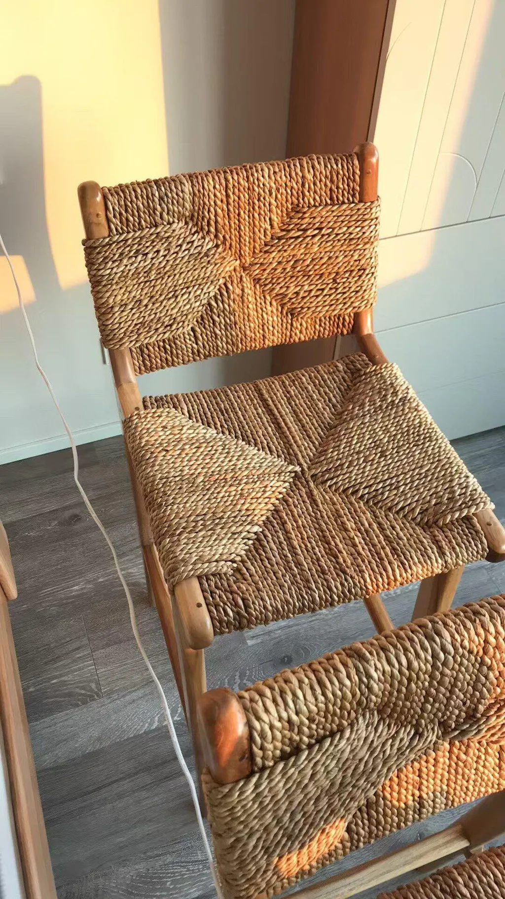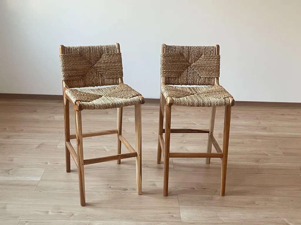Embrace the simplicity of nature with our understated design, featuring the unrefined texture of banana fiber and the elegant, fine grain of native teak wood. This combination brings you closer to the essence of the natural world. Banana fiber, known as the "fiber of the future" due to its eco-friendly properties, offers exceptional strength, softness, and resistance to corrosion. Compared to solid wood seats, it provides greater comfort for prolonged sitting. The Indonesian teak wood is hard, resistant to deformation, and boasts a fine, smooth grain. Suitable for both indoor and outdoor use, this piece combines durability with natural beauty.rattan bar stool, high back bar stool, woven seat bar stool, modern wooden bar chair, sustainable furniture, rustic bar stool, natural wood bar stool